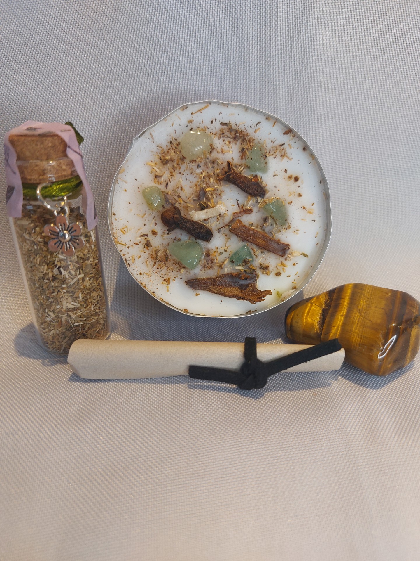 Tea light candle with herbs and Aventerine crystals.