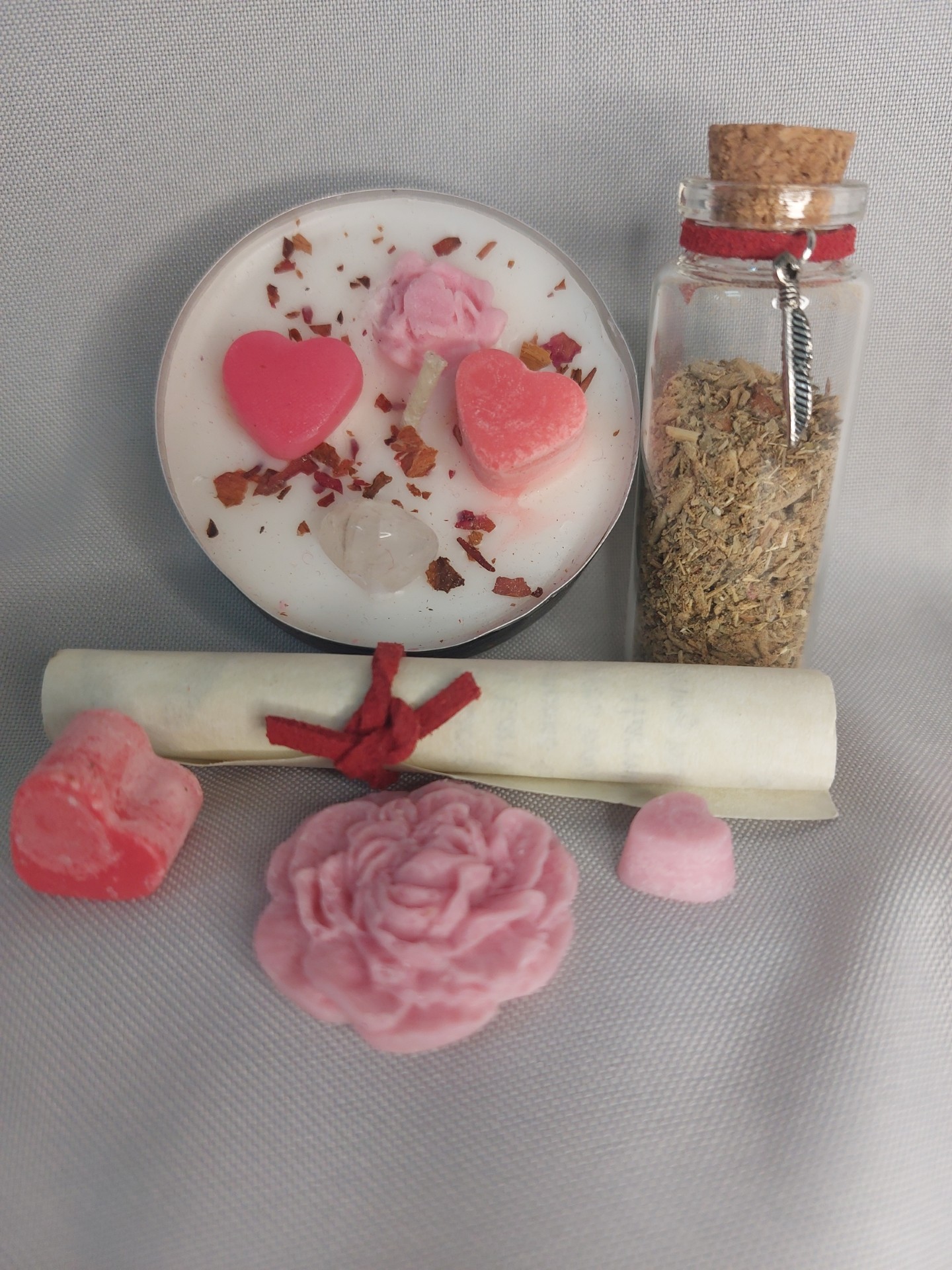 This love spell candle is designed to attract love. The candle is decorated with crystal chips and dried rose petals. An instruction scroll is included. Repeat the spell as many times as desired.