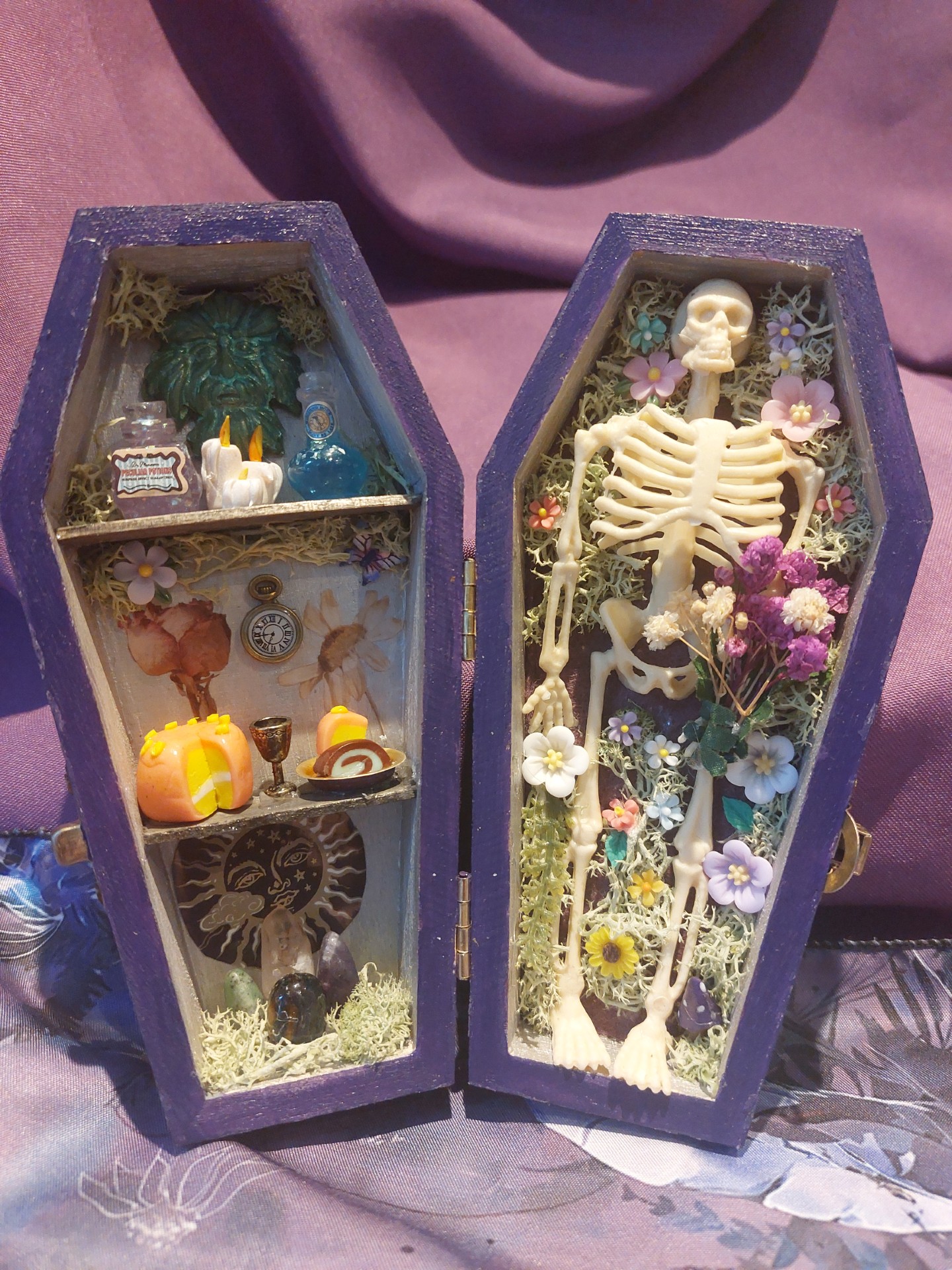 Inside you will find a skeleton surrounded with dried, silk and resin flowers.